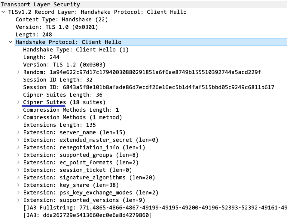 该请求将客户端支持的所有SSL/TSL协议版本, 加密算法和一个Random随机数发送给服务端