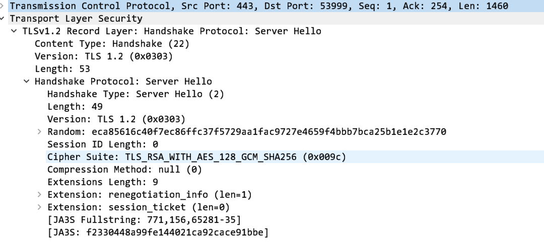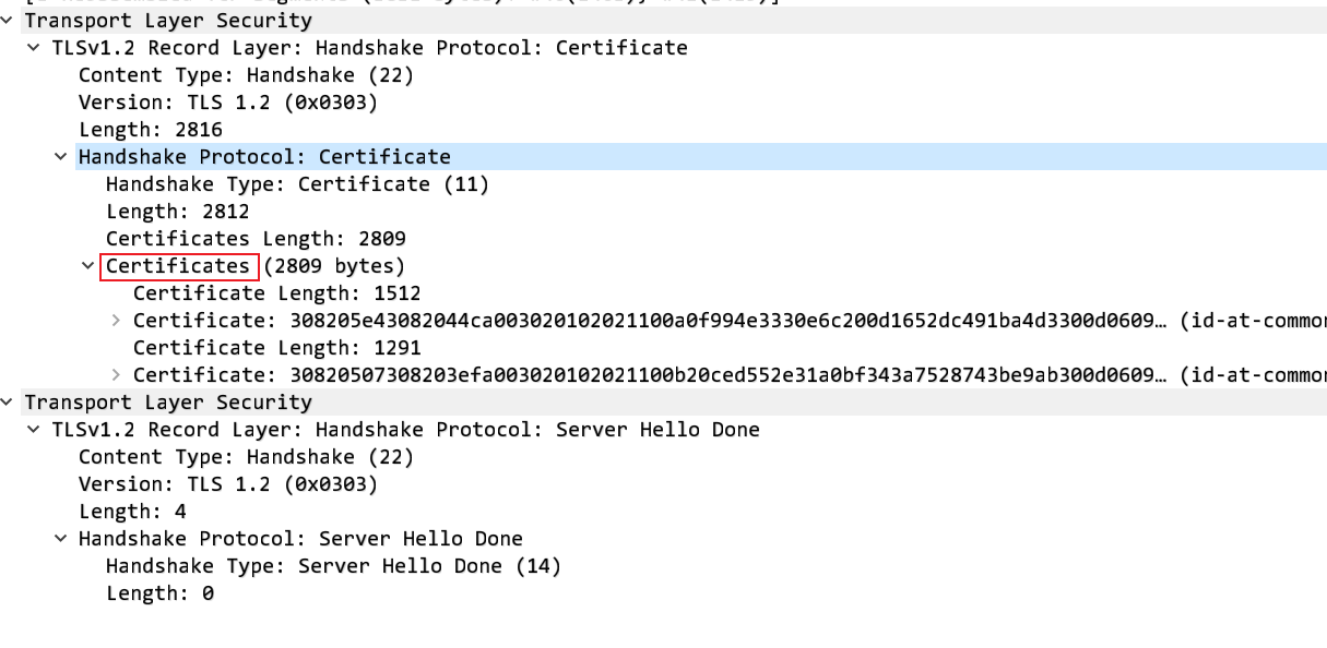 服务端发送Server Hello Done表示当前Hello过程结束, 该请求包含了服务端的SSL证书信息